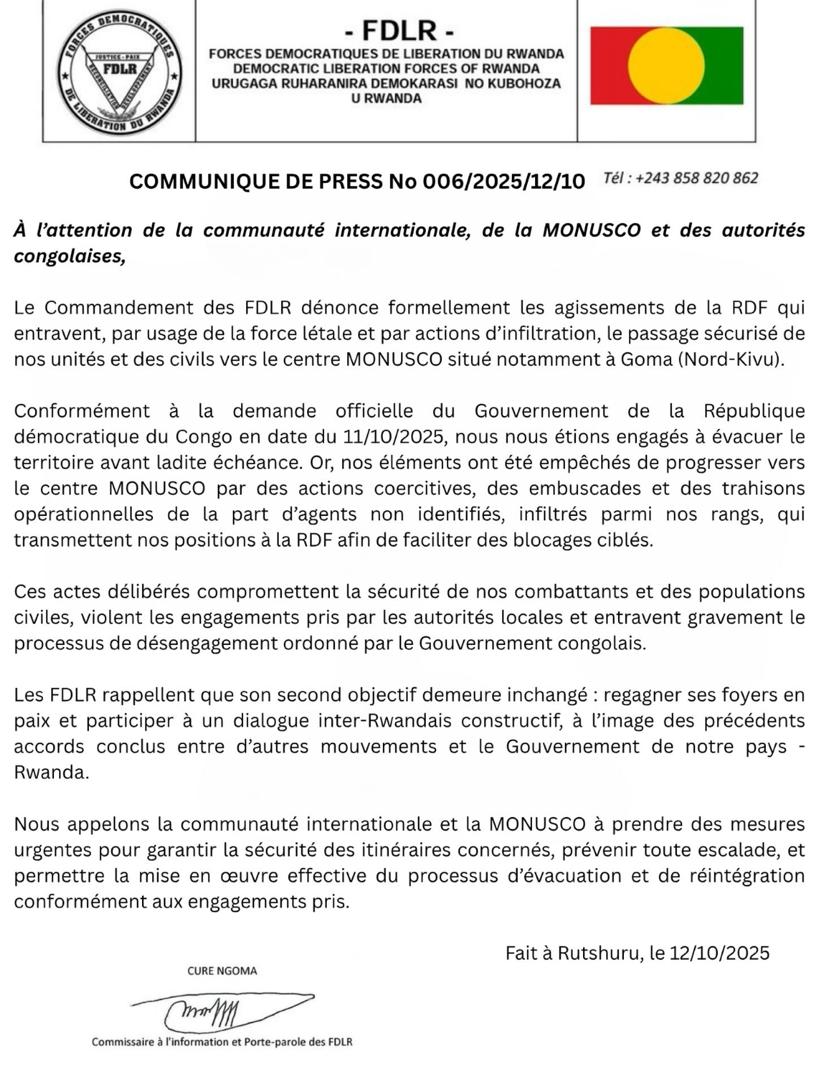 Les Forces démocratiques de libération du Rwanda (FDLR) ont accusé, dans un communiqué exploité par Election-net.com ce mardi 14 octobre 2025 la RDF d’entraver, par la force et l’infiltration, leur évacuation vers le centre Monusco de Goma, conformément à la demande du Gouvernement congolais.
