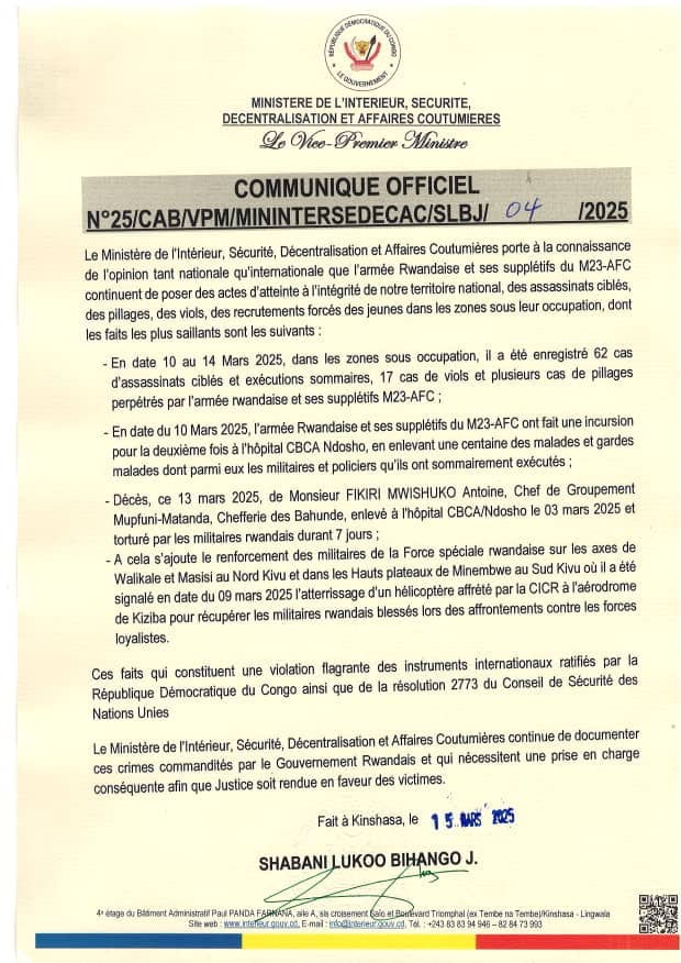 Le Ministère de l'Intérieur, de la Sécurité, de la Décentralisation et des Affaires Coutumières de la République Démocratique du Congo (RDC) a publié un communiqué officiel détaillant une série d'atrocités commises par l'armée rwandaise et ses supplétifs du groupe rebelle M23-AFC dans les régions du Nord et du Sud Kivu. Ces actes, qualifiés de violations flagrantes du droit international, ont entraîné des pertes humaines considérables et des destructions massives.
